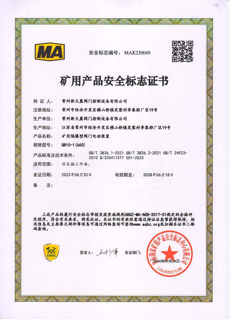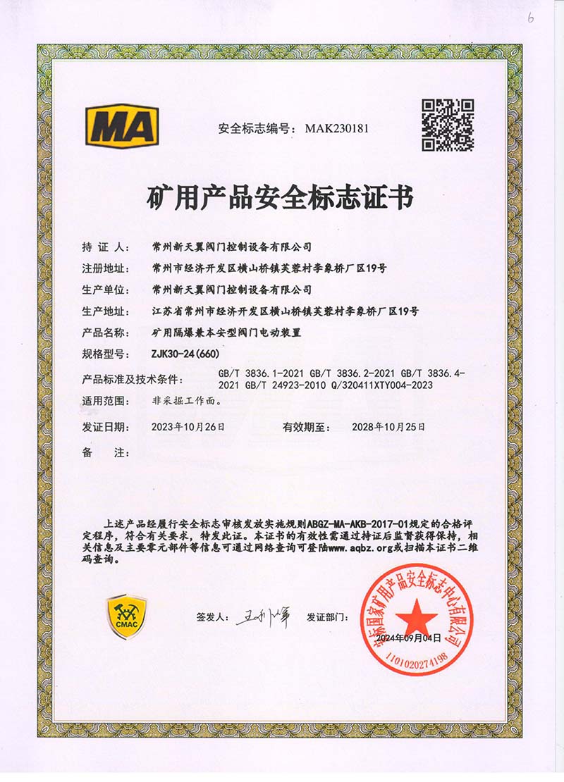 礦用產(chǎn)品安全標(biāo)志證書ZJK180-24(660)