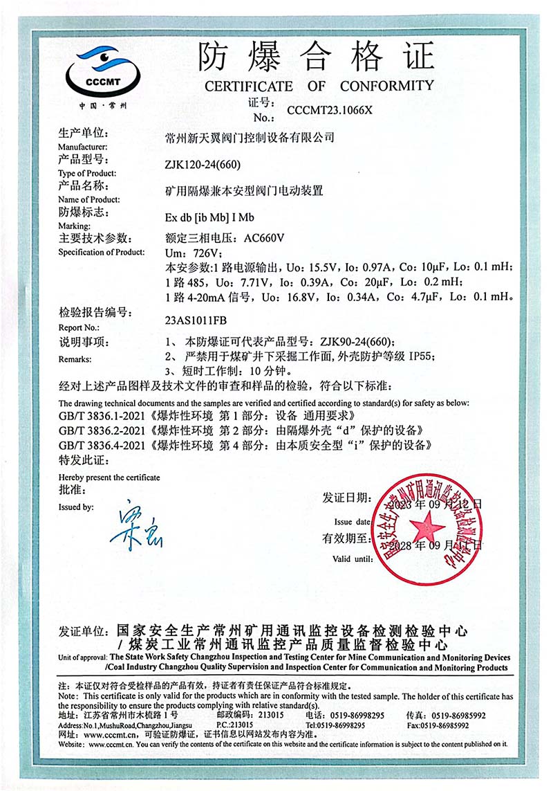 礦用產(chǎn)品安全標(biāo)志證書ZJK120-24(660)