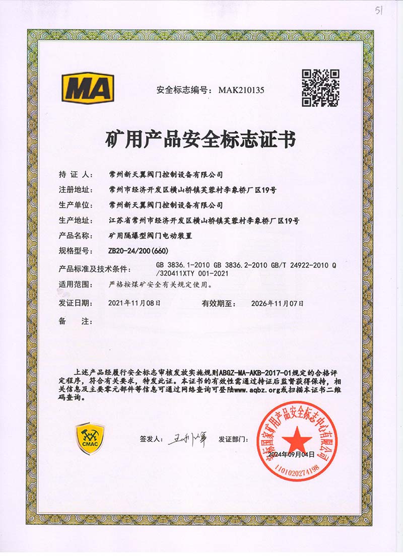 礦用產(chǎn)品安全標(biāo)志證書ZB60-24 200(660)