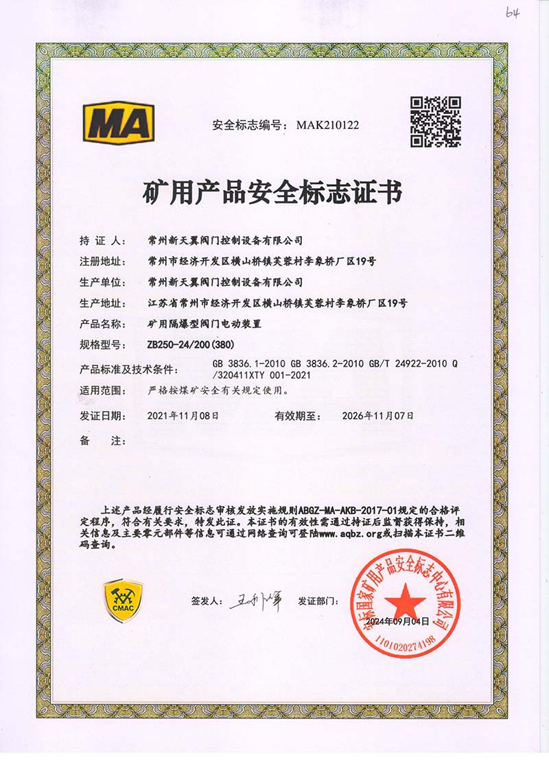 礦用產(chǎn)品安全標(biāo)志證書ZB180-24 200(380)