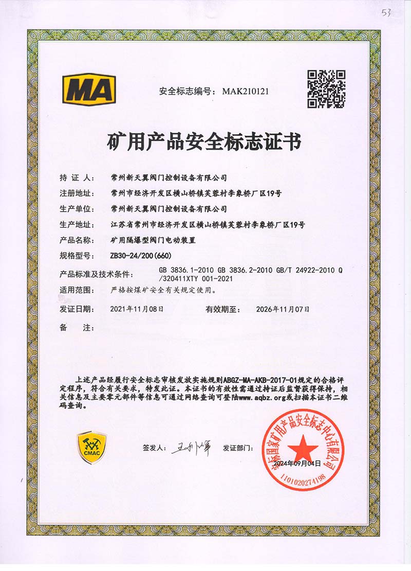 礦用產(chǎn)品安全標(biāo)志證書ZB30-24 200(660)