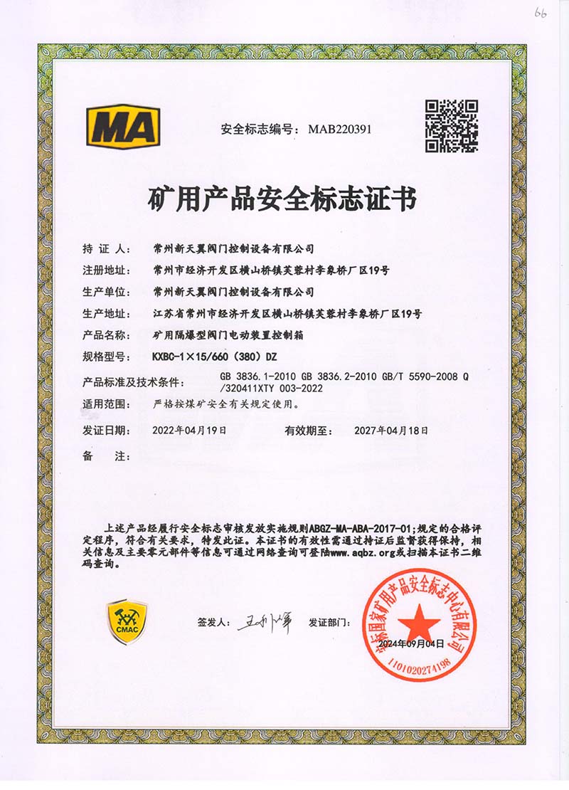 礦用產(chǎn)品安全標(biāo)志證書ZJK60-24(660)