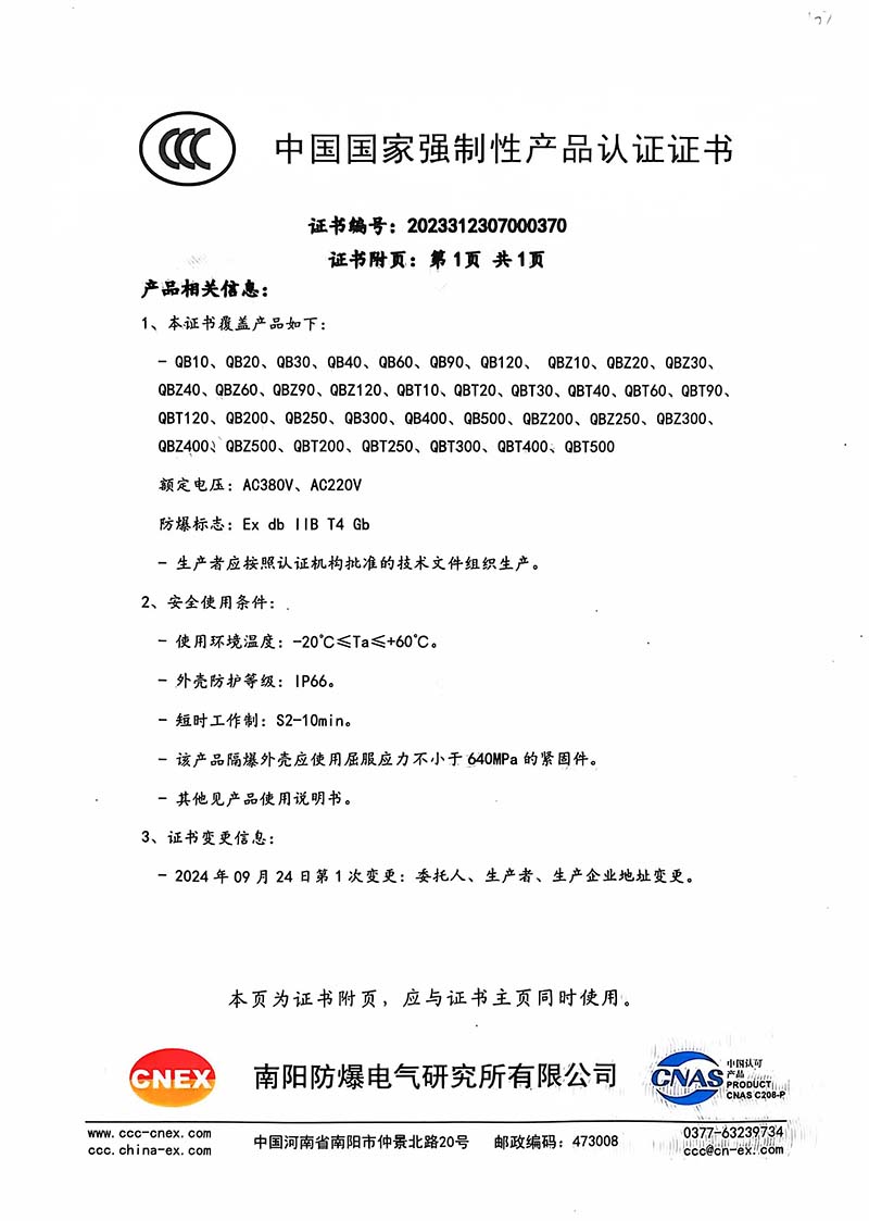 隔爆型QB QBZ QBT 220380中國國家強(qiáng)制性產(chǎn)品認(rèn)證證書107.1